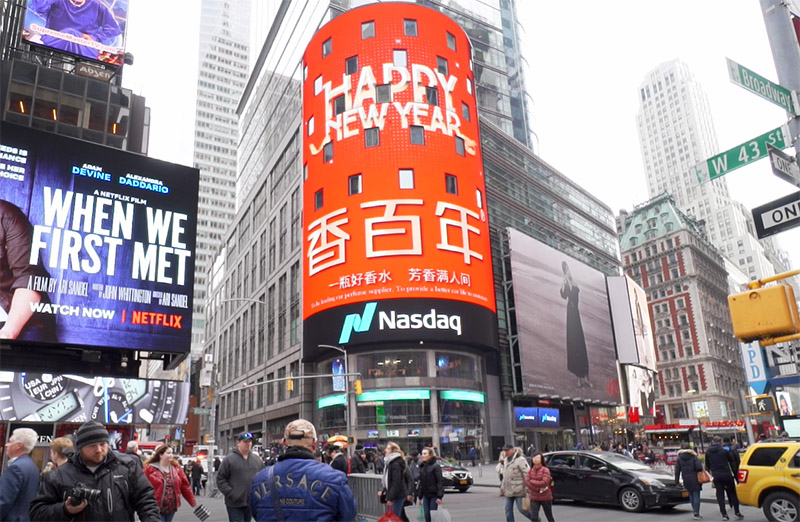 香百年作為民族品牌香薰,多年來一直受到大家的支持與關(guān)注,借著此次舉國(guó)騰歡的春節(jié),通過納斯達(dá)克戶外大屏這個(gè)窗口,向全世界人民拜年賀春,祝福各國(guó)的朋友們新年快樂,祝愿你們?cè)?018年都有一個(gè)嶄新的開始。